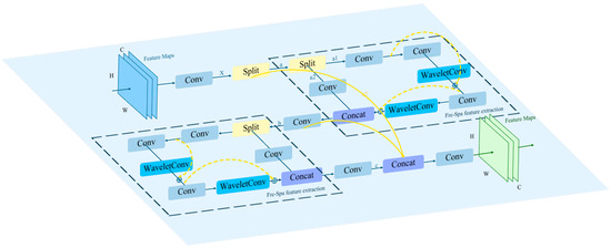 As illustrated in Figure 5, the input feature map was first processed by a convolutional layer to generate feature map , which was then evenly split along the channel dimension into continuous sub-tensor branches, a and b, using a Split operation. One of these branches, a, was fed into a region called the “Fre-Spa feature extraction” area, where frequency-domain and spatial-domain features are jointly extracted. In this region, the feature map was first split into two consecutive sub-branches, a1 and a2, using a Split operation. Each branch contained half of the original number of channels. This design ensured that different branches focus on extracting multi-scale and multi-level fine-grained information. Then, branch a1 will undergo sequential feature extraction through two Conv–WaveletConv combination blocks. Each combination block was designed with residual connections (represented by yellow dashed lines) [29], further enhancing the flexibility and diversity of feature flow within the module. This effectively alleviated feature degradation and gradient vanishing problems that can occur in deep networks.