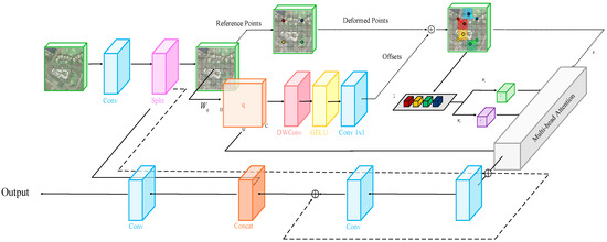 DAM is a key component of the deformable attention transformer (DAT). In the previous section, we proposed methods for addressing missed and misdetected small and densely arranged targets. However, in remote sensing images, there is another scenario where small targets are sparsely distributed in high-resolution images. Traditional multi-head attention mechanisms, for input features (where and represent image height and width, and represents the number of channels), typically map the input to query, key, and value spaces through a convolution: