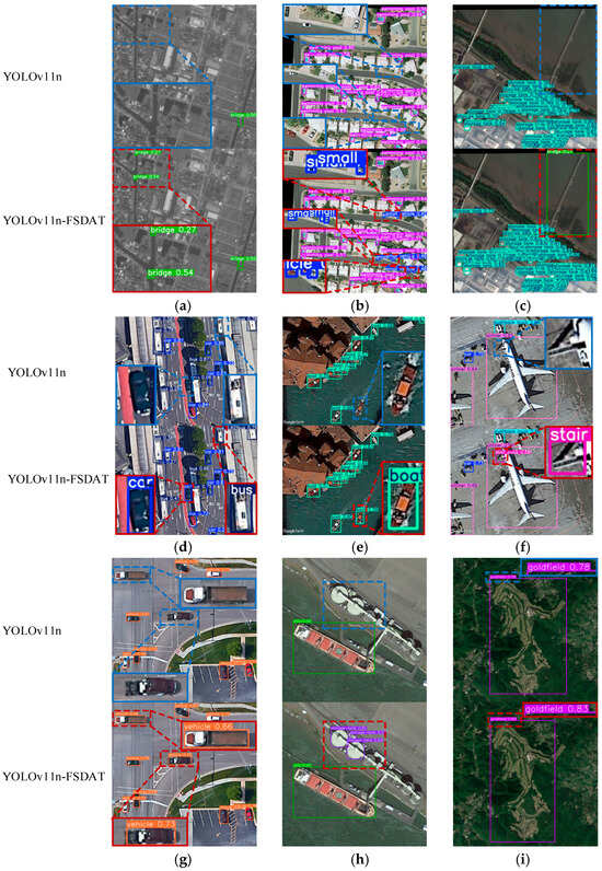 Object detection results of YOLOv11n and YOLO11-FSDAT on remote sensing images. (a) Sample image with complex background noise and small-target scale (DOTAv1 dataset). (b) Densely arranged multi-sample image (DOTAv1 dataset). (c) Multi-sample image with large class size differences (DOTAv1 dataset). (d) Multi-sample image with foreground occlusion (SIMD dataset). (e) Single-class multi-angle small-target sample image (SIMD dataset). (f) Multi-sample image with large class size differences (SIMD dataset). (g) Single-class multi-angle sample image (DIOR dataset). (h) Multi-sample image with large class size differences (DIOR dataset). (i) Single-sample image with high-target-background similarity (DIOR dataset).