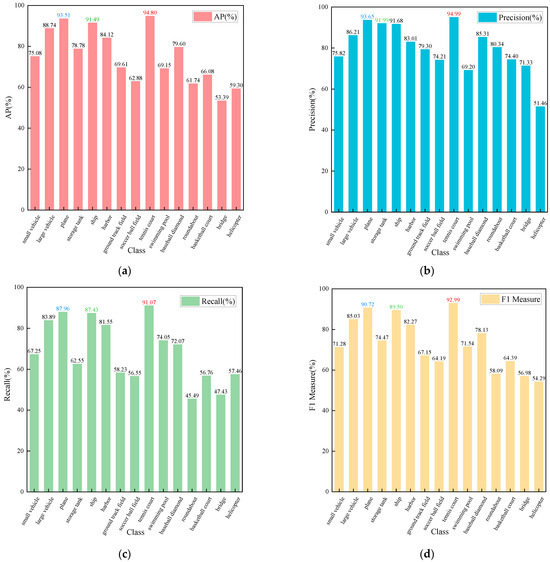 To further evaluate the detection performance across different target categories, we analyzed the AP, precision, recall, and F1-score for each class in the DOTAv1 dataset based on the proposed improved method, as presented in Table 3. Among all categories, “tennis court” achieved the highest scores across all four metrics, which can be attributed to its moderate object size and relatively clean surrounding background, allowing for more distinctive feature extraction. In contrast, the “bridge” category showed the lowest performance, likely due to its less distinctive structural features and frequent blending with complex backgrounds, resulting in a higher rate of missed detections. In order to improve readability and to facilitate comparison of indicator sizes for different types of detection targets, we used red, blue, and green to label the first, second, and third rankings of indicators. To clearly observe the variations in different metrics across target categories, we plotted bar charts for visualization, as shown in Figure 8.