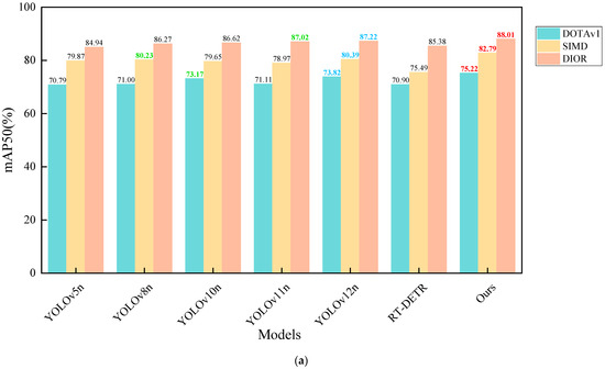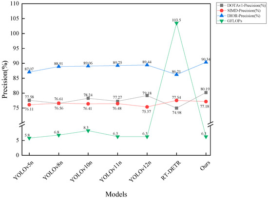 To assess the robustness and generalization capability of the proposed model, we performed comparative experiments against several state-of-the-art object detection algorithms, including YOLOv5n, YOLOv8n, YOLOv10n, YOLOv11n, YOLOv12n, and RT-DETR, using three publicly available remote sensing datasets: DOTAv1, SIMD, and DIOR. These datasets differ in terms of scene complexity, object distribution, and scale variation, thus serving as a reliable benchmark for evaluating model performance. The detailed experimental results are presented in Table 4. In order to improve readability and facilitate comparison of the size of the corresponding indicators on different datasets, we used red, blue, and green to label the first, second, and third rankings of the indicators. We plotted bar charts to compare the mAP and precision of each dataset and model, as shown in Figure 9. Additionally, to demonstrate the real-time performance of the model, we plotted a point–line graph showing the relationship between GFLOPs and precision, as shown in Figure 10.