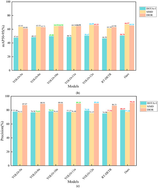 Bar charts of mAP and precision for different datasets and models. (a) Bar charts of mAP50 (%) for different datasets and models. (b) Bar charts of mAP50-95 (%) for different datasets and models. (c) Bar charts of precision (%) for different datasets and models.