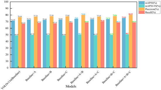 Comparison bar charts of different models’ mAP50 (%), mAP50-95 (%), precision (%), and recall (%).