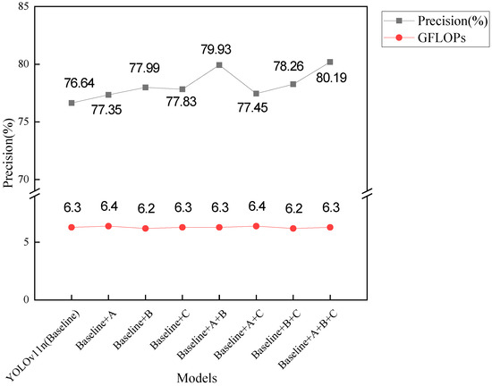 In response to the issues of uneven sample distribution across categories, missed detection in dense small-target scenes, large-scale differences between object categories, and severe background contamination typical of remote sensing object detection scenes, we proposed three network improvement methods in this paper. To evaluate the effectiveness of each method and their optimal combination, we conducted ablation experiments on the DOTAv1 dataset. Method A introduces the frequency–spatial feature extraction fusion module (Freq-SpaFEFM) into the backbone and neck of the network. Method B integrates the dynamic attention global–local fusion module (DAGLF) into the last layer of the backbone. Method C replaces the classification loss with ATFL. The experimental results are presented in Table 5. To improve readability and facilitate comparison of the size of different indicators, we used red, blue, and green to label the first, second, and third rankings of the indicators. At the same time, we plotted bar charts to compare the metrics of different models, as shown in Figure 11. Additionally, to demonstrate the real-time performance of the models, we plotted point–line charts illustrating the relationship between GFLOPs and accuracy, as shown in Figure 12.