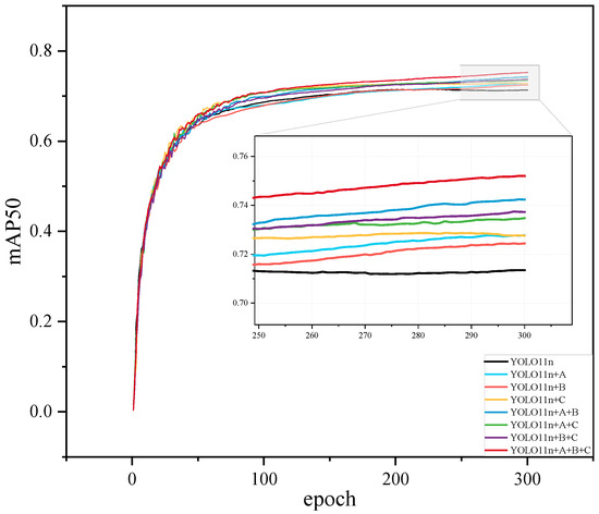The results indicate that each approach significantly contributed to enhancing model performance, and their combination led to optimal outcomes. The training process of the ablation experiment on the DOTAv1 dataset is presented in Figure 13.