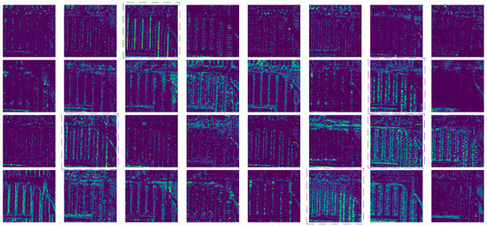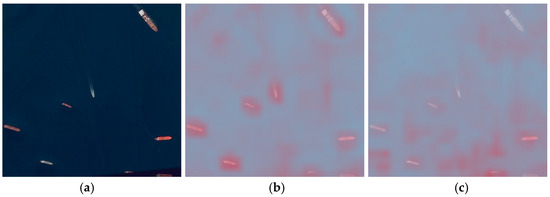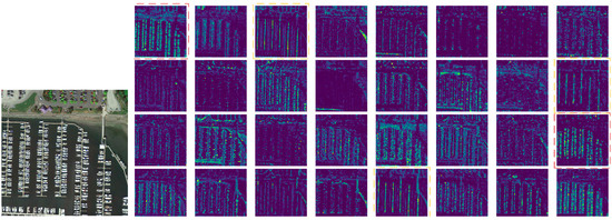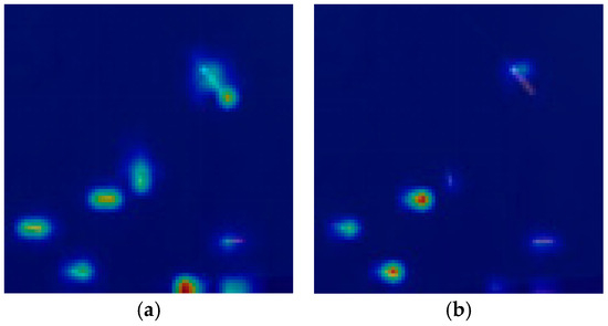 To further verify the impact of the attention matrix on the final detection results, we selected Figure 18a and used the LayerCAM algorithm to compute the class activation map (CAM) for the tenth layer (where the DAGLF and C2PSA modules are located). As shown in Figure 18, in the class activation map of the DAGLF module, each small target was highlighted, while in the class activation map of the C2PSA module, some small targets were not highlighted. This indicates that with the help of the DAGLF module, the network can indeed focus more effectively on the small targets in the image, reducing the risk of missing small targets and improving the network’s detection performance.