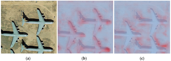 It is clear that, whether for small targets or larger targets, the DAGLF module exhibited superior performance. When dealing with small targets, the DAGLF module evenly distributed attention to each small target, which is shown as deeper red in the figure, while the C2PSA module failed to assign attention to some targets or assigned lower attention, represented by light blue or light pink in the figure. When dealing with large targets, the DAGLF module accurately allocated attention to key positions of the target, such as the nose and engine in Figure 17b, which are marked with deeper red. The high performance was largely due to the deformable attention’s adaptability and the DAGLF module’s capability for streamlined multi-source information integration.