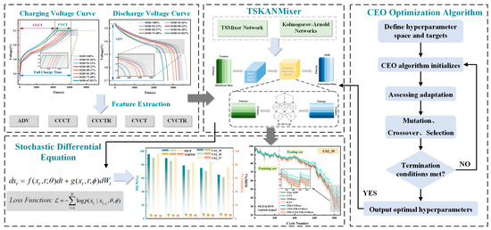 Lithium-ion batteries have become the preferred power source for electric vehicles, renewable energy storage systems, and portable electronic devices, due to their high energy density, long cycle life, and low self-discharge rate [1,2,3,4,5,6]. However, lithium-ion batteries are subject to performance degradation during use due to factors such as aging of electrode materials, electrolyte decomposition, and interfacial side reactions, and their SOH gradually declines [7]. SOH is typically defined as the ratio of the current battery capacity to its nominal capacity and serves as a key indicator to quantify the degree of battery aging. Although the SOH point prediction method has high accuracy during early cycles, the prediction error increases significantly as the number of cycles increases, especially in the later stages of decay. This reflects the existence of multiple uncertainties in SOH estimation. These uncertainties primarily originate from three sources: first, measurement errors including noise and drift in current, voltage, and temperature sensors; second, model errors arising from structural biases introduced by simplifications in equivalent circuit models or data-driven models of electrochemical processes; and third, operational conditions and the internal heterogeneity of the battery, including manufacturing variations, cycling conditions, and changes in environmental temperature. A single-point prediction cannot fully reflect the above uncertainties. It may lead to an overly optimistic or pessimistic perception of battery health, thereby affecting the assessment of failure risk and the formulation of charge/discharge strategies. For this reason, interval prediction, as an extension of point prediction, quantifies the uncertainty of SOH estimates by generating prediction results that include confidence intervals, thereby playing a positive role in risk warning, decision optimization, assessment of remaining functional life, and system robustness [8,9]. This method is based on the interval prediction framework of SDE and the CEO optimization process, which has a good modular design and can be easily integrated into existing battery management systems to achieve online processing of real-time data and parallel inferences regarding batch battery clusters.