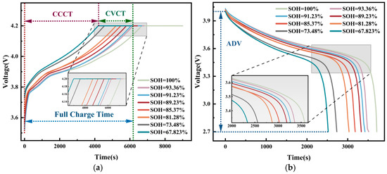 Direct measurements cannot be used to determine the SOH of lithium-ion batteries, and indirect estimation is required that involves extracting features that reflect degradation characteristics from the battery’s operating data [33,34]. Taking the CS2_35 battery as an example, this study is based on the characteristics of the battery’s charge/discharge curves, as shown in Figure 2a,b. Five features were extracted from the curves to capture the dynamic behavior of the battery during degradation, as follows: