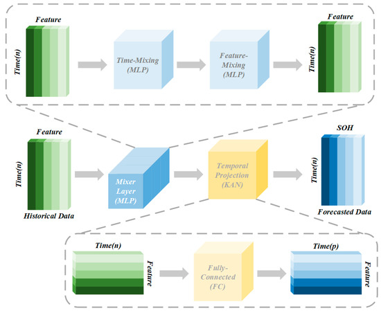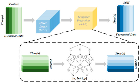 The TSKANMixer provides an efficient SOH prediction model by integrating the strengths of a TSMixer and a KAN. It can handle both long-term dependencies of time series and nonlinear relationships among features. Its overall architecture is shown in Figure 4.