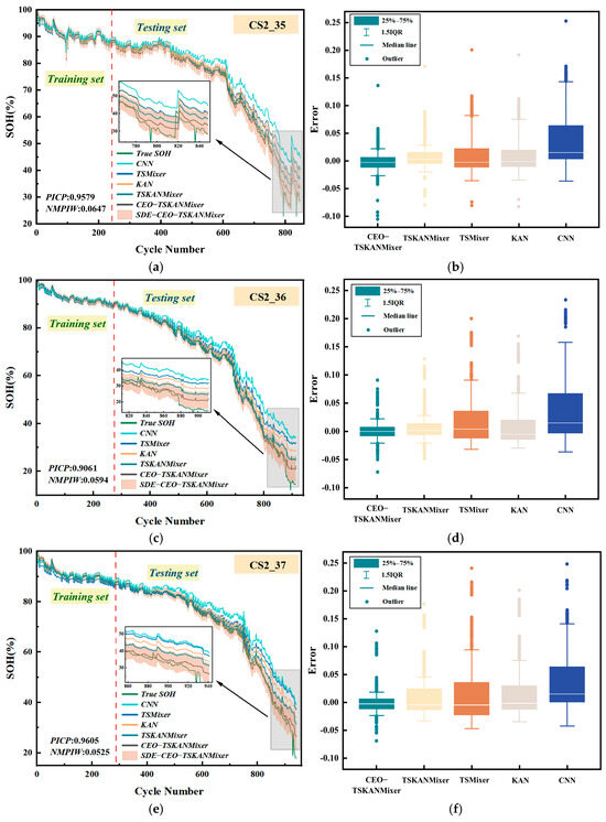 As can be seen from Figure 6a,c,e, the prediction error of each method increased gradually as the number of battery charge–discharge cycles increased, leading to increasingly uncertain predictions. Therefore, SDE was introduced to generate prediction intervals with quantified uncertainty. As can be seen from the figure, the SDE-CEO-TSKANMixer network output a narrow prediction interval width for the training dataset, indicating superior training performance and reduced uncertainty in recognizing the training data. However, with the test dataset, the model exhibited more uncertain recognition due to increased battery aging in the later stages of testing. In addition, with comparable accuracy, the SDE-CEO-TSKANMixer network provided uncertainty estimates for the predicted SOH values.