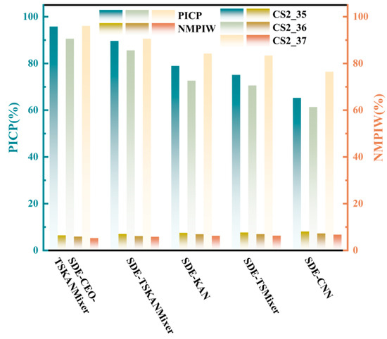 Figure 7 illustrates the PICP and NMPIW values of various models for predicting three battery SOH intervals, allowing further evaluation of the interval prediction performance. The ranges of PICP and NMPIW in the figure are between 0 and 1. For the same PICP, a smaller NMPIW indicates higher interval prediction quality, indicating that the model provides narrower and more accurate prediction intervals [45,46]. Conversely, for the same NMPIW, a larger PICP indicates a greater probability of capturing the actual target value, indicating that the model provided a more reliable and accurate prediction interval. As shown in the figure, the SDE-CEO-TSKANMixer model exhibited the best performance in terms of interval prediction and accuracy. The SDE-KAN and SDE-TSMixer models exhibited similar interval prediction performance, both outperforming the SDE-CNN model. The SDE-TSKANMixer further improved the coverage of the prediction interval. As shown in Table 3, the PICP of the SDE-CEO-TSKANMixer model exceeded 90% in all datasets, and the NMPIW of each dataset did not exceed 6.47%, providing accurate SOH prediction values and reasonable interval estimates. These results indicate that the prediction intervals generated by the SDE-CEO-TSKANMixer model covered most of the data points with relatively narrow interval widths, reflecting the effectiveness and reliability of the SDE-CEO-TSKANMixer network.