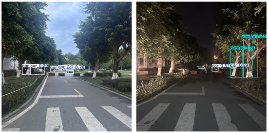 The geometric and semantic characteristics of small objects are critical intrinsic factors contributing to the difficulty of their detection, particularly in complex traffic scenes. These challenges typically manifest in three main forms. Firstly, small objects generally occupy very limited pixel areas (e.g., fewer than 32 × 32), making it difficult to preserve sufficient structural detail in deep feature maps. As deep neural networks conduct multiple downsampling operations, such information is often lost or blurred, which significantly hampers both classification and localization performance [12]. Secondly, small traffic objects exhibit considerable shape diversity. They encompass a broad range of categories, including traffic signs, cones, mirrors, vehicle tail lights, and signboards, and they often share strong visual similarity and low inter-class variance, thereby increasing the likelihood of misclassification and false detections [13]. As shown in the left-hand image of Figure 1, the detection accuracy for vehicles partially occluded by trees is notably lower than that for unobstructed vehicles. Thirdly, such objects are frequently subject to partial or complete occlusion by surrounding elements such as vehicles, vegetation, or pedestrians, or they may appear only momentarily in dynamic scenes. In such situations, accurate detection requires robust contextual modeling and spatio-temporal reasoning capabilities [14]. To address these intrinsic challenges, detection models must incorporate targeted advancements in feature extraction, scale-aware representation, attention mechanisms, and contextual enhancement techniques.