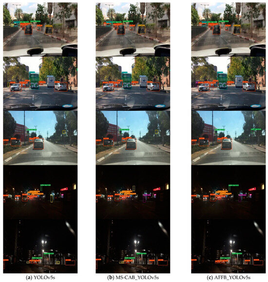 As shown in the detection results in Figure 2, sourced from [20], both the MS-CAB_YOLOv5s and AFFB_YOLOv5s models improved detection performance in traffic scenes, with the AFFB_YOLOv5s achieving the best results, particularly for small objects located far from vehicles. This has significant implications for enhancing the stability and efficiency of autonomous driving systems and for preventing traffic accidents.