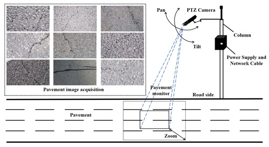 Extensive pavement image acquisition based on the fixed PTZ camera alongside the road with the function of pan, tilt, and zoom.