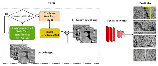 CEFR-based crack recognition workflow. The original images is processed by CEFR and then transform to CEFR feature saliency map. The yellow rectangles in the prediction means the recognition result of neural networks.