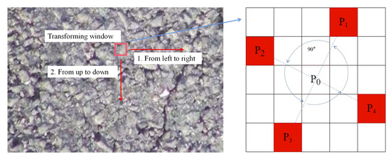 Suppose the resolution of an image is , so the whole image needs transforming windows; i denotes the serial number of the transforming window, . Within each transforming window, there are h groups of pixels participating in the rotational comparison, ; j denotes the serial number of the rotational comparison pixel group, , and in each group of rotational comparison pixels, n is used to identify the position of each pixel, . So we denote the pixel at each position in the transforming window as , and the center pixel of each transforming window is denoted as .