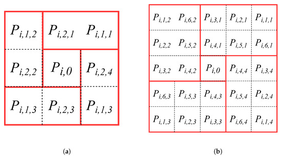 Demonstration of different transforming window and rotational comparison pixel groups. (a) transforming window, two rotational comparison pixel groups. (b) transforming window, six rotational comparison pixel groups.
