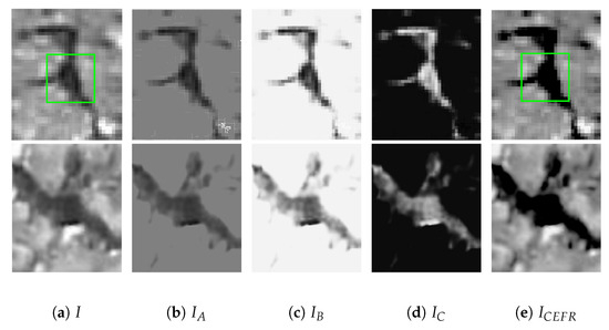 belongs to the low-intensity pixel region; evidently, from the large number of images obtained, the pixel intensity range of the crack region does not exceed . Therefore, the result of Equation (6) becomes zero in the uint8 image format. Thus, even without knowing the ideal distribution model of cracks and noise in the original image, we can still transform the pixel distribution within cracks into a more uniform form. This reduces the feature complexity of the crack region while assigning it robust and distinctive crack features, as highlighted in the green box in Figure 6a,e. In summary, using Equations (7) and (8), all crack features are merged into the final CEFR feature saliency map, denoted as (Figure 6e).
