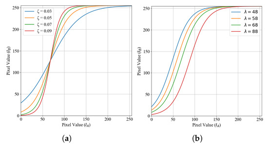 High-contrast crack images enhance morphological pixel intensity, improve crack boundary detection, and enhance neural network-based crack recognition performance. Therefore, this subsection explores a method for obtaining high-contrast crack images. The distinction between cracked and background pixels depends on the magnitude of the pixel value step along crack boundary pixels. A larger pixel value step significantly improves the crack boundary differentiation. To achieve this, we propose a novel nonlinear pixel stretching approach, as defined in Equation (3), to enhance crack edges with pronounced pixel value steps (Figure 7):