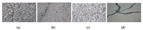 Four categories of cracks in our work. (a) longitudinal crack. (b) oblique crack. (c) transversal crack. (d) repaired crack.