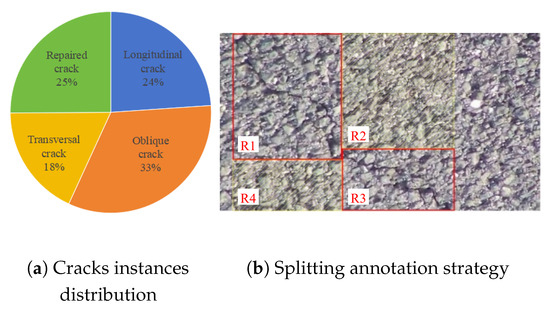 Eight hundred seventy-eight pavement crack images are obtained by flipping and rotating the images of cracks collected from highways based on the fixed PTZ camera on G4/Jingshi Highway [40], named “Dataset based on the fixed-PTZ”, PTZD. The images are divided into a training set, a validation set, and a testing set based on an 8:1:1 ratio and formatted into a VOC dataset. The cracks are classified into four categories according to their direction: longitudinal crack, oblique crack, transversal crack, and repaired crack, as shown in Figure 9. The number of instances in each category is shown in Figure 10a. Among them, the resolutions of the repaired crack images are 1400 × 750, and the other crack images are between 585 × 303 and 1400 × 750. Note that rectangular box annotation is usually used in object recognition. For longitudinal and transversal cracks, the rectangular boxes can contain most of the crack information and only a small amount of background information. However, for oblique and repaired cracks, the proportion of crack information in the rectangular box is much lower than that of the background information. In such situations, neural networks will be distracted by too much background information in the annotation box; neural networks may learn the wrong crack features. Therefore, to minimize the interference from background information, we use multiple splitting annotations for oblique and repaired cracks, as shown in Figure 10b. R1 and R3 are the annotation boxes, and R2 and R4 are the background areas reduced by splitting annotations. There is no correlation between the size of the annotation box and the percentage of crack information inside the annotation box, but some background information can be removed by splitting the annotation. At the same time, experiments reveal that too many annotation boxes used on one crack will lead to severely missed detection. Therefore, we use 1–2 annotation boxes for splitting the annotation of oblique cracks and 2–4 annotation boxes for splitting the annotation of longer repaired cracks.