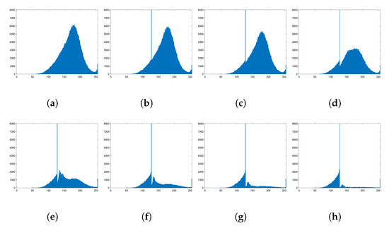 Histogram graph of with different thresh from −20 to 40. The higher the increase, the more pixels are mapped to 128 to obtain a uniform background. (a) origin. (b) . (c) . (d) 0. (e) 10. (f) 20. (g) 30. (h) 40.