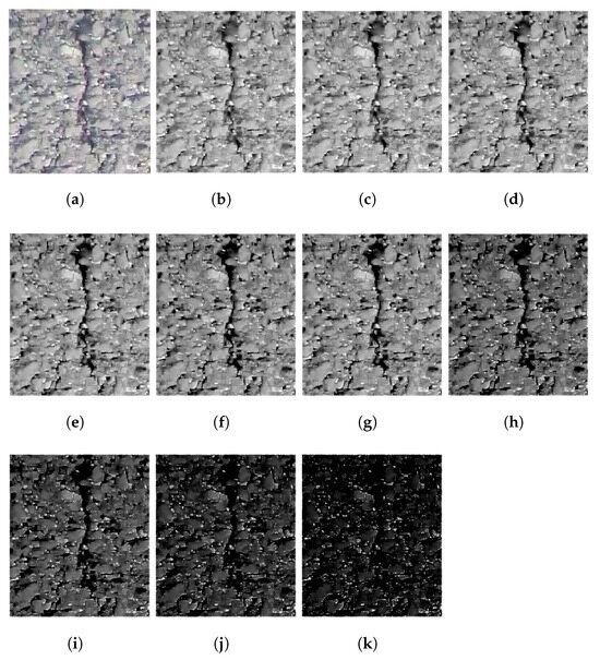 controls the trend of the slope of the mapping curve, and for the same , the larger is, the more pixels are mapped to lower-value pixels, but it may also lead to the enhancement of the background shadow texture, which interferes with the correct representation of the cracks.
