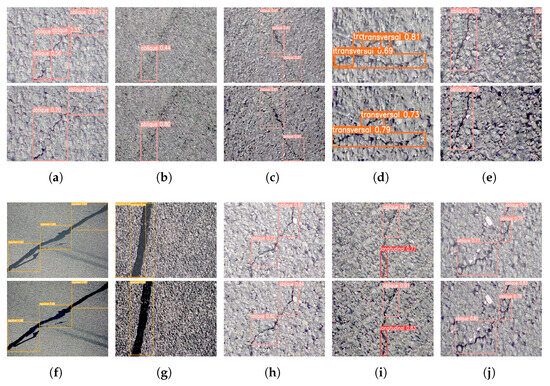 Demonstration of cracking performance improvement. The first row is the POD of PTZD, and the second row is the performance of optimal crack recognition workflow. (a–c) Discontinuous and blurred boundary cracks; (d,e). Cracks under complicated pavement textures; (f,g) Repaired cracks; (h) Ordinary cracks; (i,j) Ordinary blurred cracks.