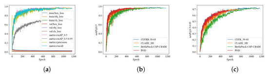 Experiment results curves. (a) Training and validation curves of optimal workflow. (b,c) Comparison of mAP@0.5 and mAP@0.5:0.95 curves for optimal workflow, two advanced crack identification methods, and POD.