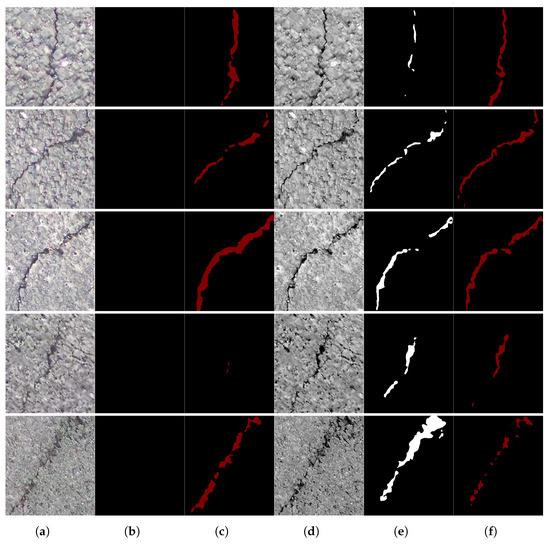 Performance of the crack segmentation test in PTZD with the best weights of Unet and DeepLabV3+ trained in dataset Crack500. Columns (b,c) show the crack segmentation result of images without CEFR; and columns (d,e) show the crack segmentation result of images processed by CEFR. (a) Pic(W/O(CEFR)). (b) Unet. (c) DeepLabV3+. (d) Pic(W(CEFR)). (e) Unet. (f) DeepLabV3+.