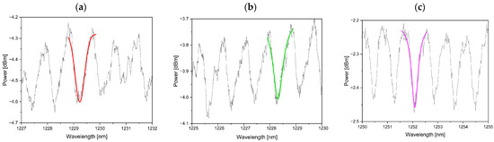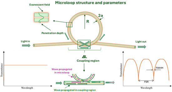 During the fabrication process of an MFR, several parameters, such as the radius of the microloop (R), the diameter of the TOF (2a), and the length of the coupling region (ΔL), must be considered (Figure 2). All of these have a significant impact on the sensitivity, detection limit, wide dynamic measurement range, and Q-factor [14,32]. The last of the mentioned parameters, called the Q-factor, is one of the most important factors describing MFR [4]. It is a measure of the strength of the damping in the resonator’s oscillations. To determine this parameter, the resonance wavelength (λres) and the full width at half maximum (FWHM) of the transmitted power are used (Figure 2). It is a ratio of λres and FWHM [25]. The higher the Q-factor, the narrower and more defined the resonance peak is, which leads to higher sensitivity and lower energy loss. Typical MFRs have a Q-factor in the range of 103 to 106 [4].