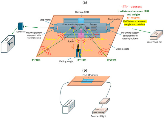 To examine the sensor’s response to vibrations, the sensor was left mounted on the FOTET setup and exposed to vibrations. One end of the optical fiber was connected to a PDA10CS-EC detector, ThorLabs (Newton, MA, USA), which was linked to a digital oscilloscope DS7034, Rigol (Suzhou, China), while the other end was connected to a 1550 nm laser source, ThorLabs S3FC1550 (Newton, MA, USA). The measurement system is illustrated in Figure 6a. Vibrations were induced by dropping a 94 g weight onto the optical table. The shape of the weight was a cylinder (a metal post). After the weight was dropped onto the optical table, the FOTET setup, including its mounting holders, began to vibrate. These vibrations were then transmitted to the MLR structure (Figure 6a). To standardize measurements, the fall occurred at three different heights, h: 1, 7, and 14 cm, and the distance, d: 41, 73, and 90 cm, was measured from MLR to weight. A key aspect of the measurements is the way the vibrations spread. When analyzing the results, an important parameter is also the distance between the weight and the holders D. When the MLR is positioned directly in front of the falling weight, vibrations of equal intensity travel symmetrically toward both holders. In this case, the waves move in opposite directions, which can lead to interference. In contrast, when measurements are taken from opposite corners of the optical table, the holders are located at different distances from the point of impact. In this case, the wavefront reaches one holder before the other. In summary, the angle of measurement is also important to analyze a result.