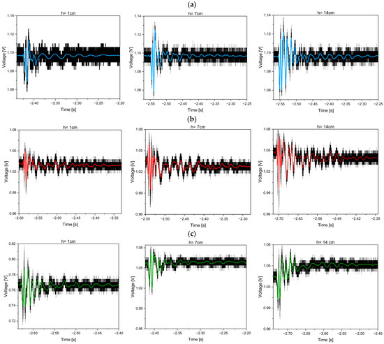 The investigation into the influence of TOF elongation and the number of twists began with measuring the sensor’s sensitivity to vibrations, observed as time-domain voltage changes. Examples of the recorded time responses for the TOF with an elongation of l2 = 25 mm and the created MLR with one and two twists are shown in Figure 7. The black signal represents the original measurement obtained with the oscilloscope, and by a color line a smoothing function to remove noise from signals was applied. Initially, the TOF without the MLR structure (a straight) was tested as a reference. The corresponding results for the straight TOF are presented in Figure 7a (blue line). The results for MLRs with one twist (red line) and two twists (green line) are shown in Figure 7b and Figure 7c, respectively. A comparison of signal changes for TOFs elongated to approximately l1 = 20 mm and l2 = 25 mm, with and without MLRs, is provided in Table 1, Table 2, Table 3 and Table 4.