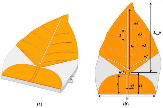 The flexible leaf-shaped antenna designed in this paper is based on a monopole antenna and integrates the shape characteristics and venation patterns of aquifoliaceae leaves. Figure 1a shows the three-dimensional structure of the antenna, which consists of one layer of metal and one layer of dielectric. The metal layer can be divided into the feed structure and the radiation element. The coplanar waveguide (CPW) transmission structure is used in the feed structure, enabling an ultra-low profile. The dielectric material used is a 0.065 mm thick flexible Polyimide (PI) film. PI is a high-performance flexible microwave substrate, and its environmental adaptability is shown in Table 1. The traditional rectangular ground plane is replaced with a semi-elliptical ground plane, improving the transition matching between the feed structure and the radiation element, thereby expanding the antenna’s bandwidth. The radiation element integrates the pointed elliptical shape of holly leaves and the symmetrical vein distribution characteristics. The slots in the shape of leaf veins are etched on the radiation metal patch, with each vein slot forming a resonant frequency point to achieve wideband performance. Figure 1b shows the antenna’s layout, where it can be seen that there is one main vein slot and four symmetrical branch vein slots on the metal patch, with the distance between adjacent branch vein slots being T. The arc angles of the vein slots from top to bottom are e4, e3, e2, and e1.