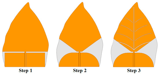 The evolution process of the design of the flexible leaf-shaped antenna can be divided into three main steps, as shown in Figure 2. Step 1 is the initial structure, where the feeding structure uses a symmetrical coplanar waveguide, and the overall height of the radiation element is similar to that of a leaf. As shown in the simulation curve in Figure 3b, the S11 performance of the initial structure is poor and does not meet the wideband requirements.