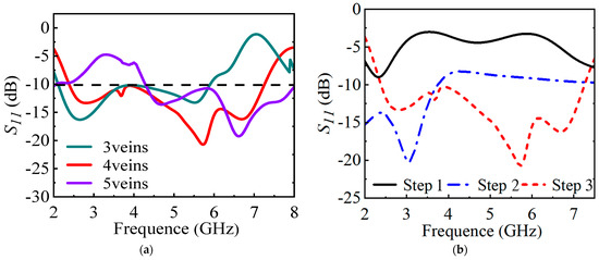In Step 3, a main vein slot and four symmetrical branch vein slots are etched on the radiating patch. The vein slots introduce multiple inter-slot capacitances. The vein slots not only provide conductive paths of different electrical lengths, naturally supporting multi-frequency resonance, but also improve the matching performance in the high frequency band. The effect of different numbers of vein slots on the bandwidth widening varies, as shown in Figure 3a. We ultimately chose the structure with four vein slots. The above structural optimization increases the antenna’s impedance bandwidth from 2.4 GHz to 7.1 GHz, achieving a relative bandwidth of about 100%, resulting in wideband performance.
