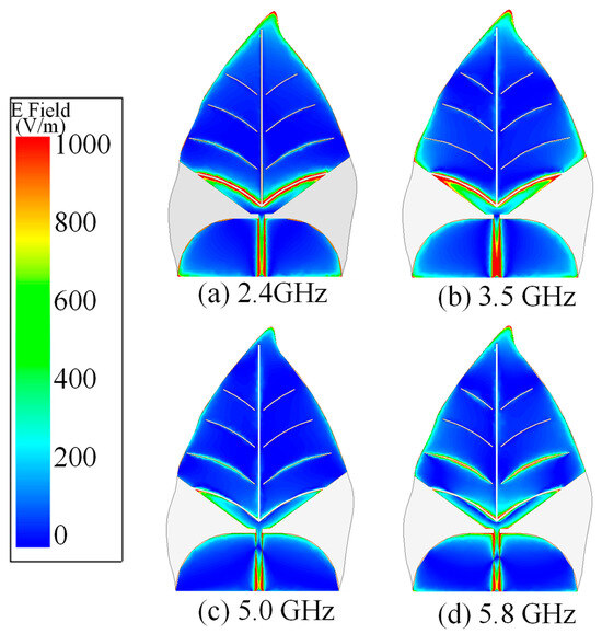 Figure 4 shows the electric field distribution at some commonly used frequencies. As shown in Figure 4a, at low frequencies, the current is mainly concentrated in the lower half of the petiole region and the edge of the gap in the upper half of the leaf. As the frequency increases, the current spreads towards the upper half of the leaf, as shown in Figure 4b,c. At 5.8 GHz, the current density at the gap edge of the upper half leaf’s vein increases significantly, thereby exciting additional modes. In Figure 4d, it is also observed that there is a noticeable current distribution at the edge of the ground plane, indicating that the semi-elliptical ground structure has a significant impact on the antenna’s impedance matching.