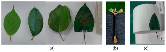 (a) A photograph of leaves and the leaf-shaped antenna. (b) A detailed image of the fabricated prototype. (c) The test scenario for the bending performance of the leaf-shaped antenna.