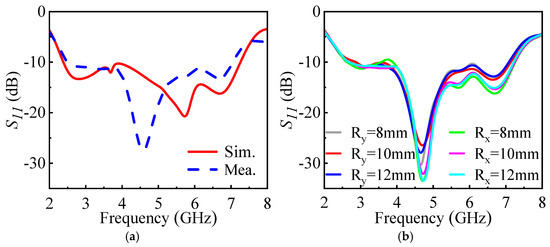 (a) The comparison of S11 between the measured result and the simulation result. (b) The S11 variation under different bending radius Rx/Ry values.