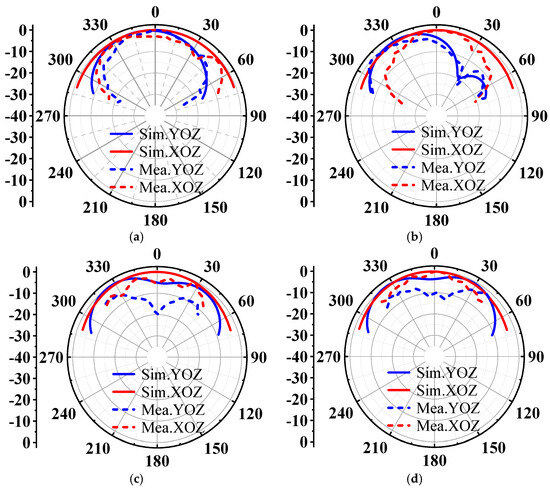 The comparison of the radiation pattern of the antenna between simulation data and the measured results: (a) 2.4 GHz; (b) 3.5 GHz; (c) 5.0 GHz; (d) 5.8 GHz. The XOZ plane corresponds to phi = 90°, theta = 0°. The YOZ plane corresponds to phi = 0°, theta = 0°.