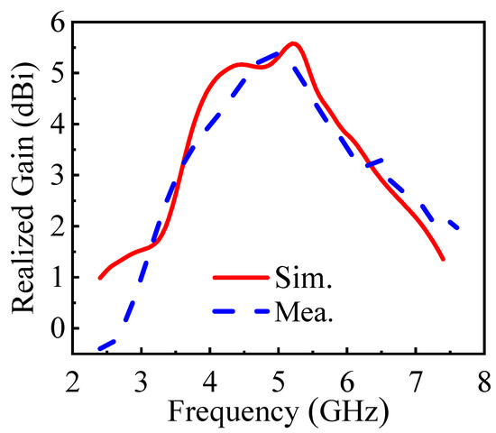 The radiation performance of the leaf-shaped antenna was tested in a microwave anechoic chamber using the planar near-field scanning method, as shown in Figure 7. Due to the travel limitations of the scanning test rack, the test range of the antenna radiation pattern is ±60°. The normalized radiation pattern of the tested antenna is shown in Figure 8, and the measured results are generally consistent with the simulation results. Figure 9 shows the test curve of the antenna realized gain, where it can be seen that the measured results closely match the simulated results, with a maximum gain of 5.4 dBi around 5.0 GHz.