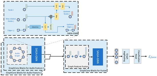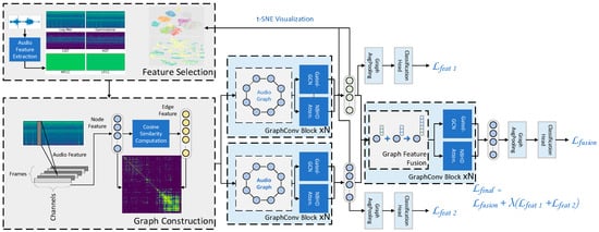 Graph structures provide a framework for addressing these limitations by modeling relationships and dependencies within data. Graph neural networks (GNNs) enable the representation of structured data and the extraction of relational patterns through message-passing mechanisms. These models have significantly advanced fields such as computer vision [21], natural language processing [22], and decision-making systems [23]. In the audio domain, graph structures offer a way to represent both the features of audio frames and their interdependencies as nodes and edges, capturing richer contextual information than traditional methods [24,25]. In the field of SA, there have also been some studies that have proposed the use of graph structures to represent audio for better modeling of the temporal dependencies and complexity patterns inherently exhibited in audio data [26,27], which has achieved a better performance than traditional approaches on a number of public datasets. Despite the potential of graph methods for audio processing, the applicability of different graph structures to different audio features and combinations, especially in SA tasks, remains relatively unexplored. Furthermore, recent works in the field of SA audio have highlighted the challenge that SA audio—as a subset of general audio—faces, characterized by a preponderance of noise segments and a scarcity of critical segments [28].