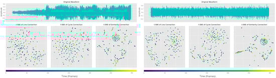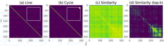 Dynamic graph structures have been proven to enhance the data representation capabilities of graph learning architectures across various domains [47]. Some work has suggested a dynamic approach to graph construction when composing graphs of audio to take into account the inherent evolutionary patterns of audio data [39,41]. Therefore, a similarity map can be obtained by calculating the similarity between pairs of nodes to be used as an adjacency matrix for constructing the graph (Figure 2c,d). Specifically, the following equations express the similarity matrix by calculating cosine similarity of graph nodes feature: