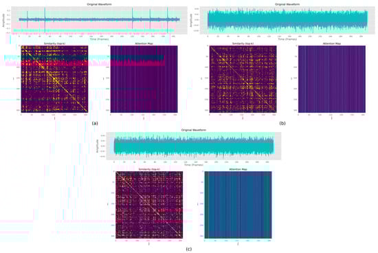 The role of global attention in our framework is clearly demonstrated in Figure 3, which reveals important distinctions between similarity-based and attention-based node connections. The similarity matrix establishes connections between nodes purely based on frame-level feature similarity, while the attention map shows a more nuanced pattern of connectivity that incorporates additional contextual information. In Figure 3a, we observe that nodes receiving larger attention weights correspond to frames with higher amplitude in the original waveform (particularly between frames 0 and 60), despite these frames showing relatively sparse connections in the similarity matrix. This discrepancy suggests that the attention mechanism is capturing important signal characteristics that simple similarity measures might miss. Further examination of Figure 3b,c reveals that the attention weights are strategically concentrated at specific nodes that complement the similarity matrix connections. For instance, frames 0–50 in Figure 3b and frames 150–200 in Figure 3c show particularly strong attention weights, even though these regions correspond to sustained sounds in the original waveform. Rather than just responding to signal energy, the attention weights appear to be learning meaningful relationships between nodes based on the underlying audio events and their contextual significance. The attention map’s ability to identify and emphasize these event-related nodes demonstrates its capacity to extract features that are crucial for accurate audio analysis. This analysis suggests that our global attention mechanism effectively identified and emphasized nodes that correspond to meaningful audio events rather than just matching low-level features. The complementary nature of these two connection methods, with similarity capturing local feature relationships and attention highlighting event-related nodes, creates a more robust and informative graph representation for audio analysis tasks.
