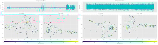 The superior performance of SAGA-GNN across both the DCASE 2020 Task2 and VGGSound-DR datasets can be attributed to its dual mechanisms of max-relative neighbor sampling and learnable gated attention, which directly address the unique challenges of SA audio. Unlike conventional graph models that uniformly aggregate node features, SAGA-GNN selectively emphasizes task-relevant audio frames by dynamically constructing graph connections based on feature dissimilarity, thereby minimizing the influence of irrelevant or noisy segments. The gated-attention mechanism further refines this by adaptively modulating edge weights based on contextual importance, enhancing the model’s sensitivity to sparse but critical audio events such as alarms, explosions, or anomalies in machine operation. This combination ensures robust representation learning, particularly in the presence of ambient noise or variable event timing, leading to improved anomaly detection and classification accuracy. To visualize, we compared the audio graph node distribution of Gated-GCN and SAGA-GNN on the same SA audio samples (as shown in Figure 13). It is evident that regardless of whether there are fewer event nodes or more noise nodes, the audio graphs processed by SAGA-GNN are more compact, with fewer scattered nodes. This demonstrates the effectiveness of the proposed method.