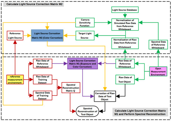 Principle of the spectral reconstruction method based on image color correction. The red line section represents the first step of our method, which involves acquiring the reference whiteboard response values and constructing the spectral reconstruction matrix . The dark-purple-filled rectangle indicates the calculation of the correction matrix . The green line section represents the second step, which includes acquiring the reference whiteboard response values and estimating the illuminant in the open environment. The light-blue-filled rectangle denotes the computation of the correction matrix . Finally, the black line section at the bottom illustrates the correction and reconstruction process applied to the test samples.
