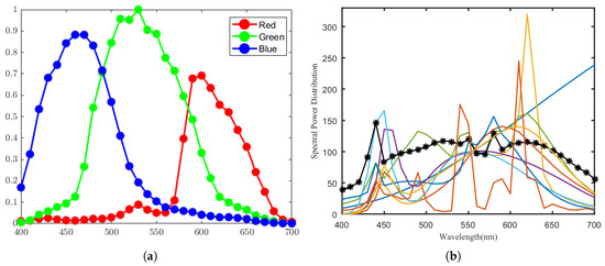 (a) Camera spectral response functions of Nikon D7200; (b) spectral power distribution of the 10 collected illuminants.