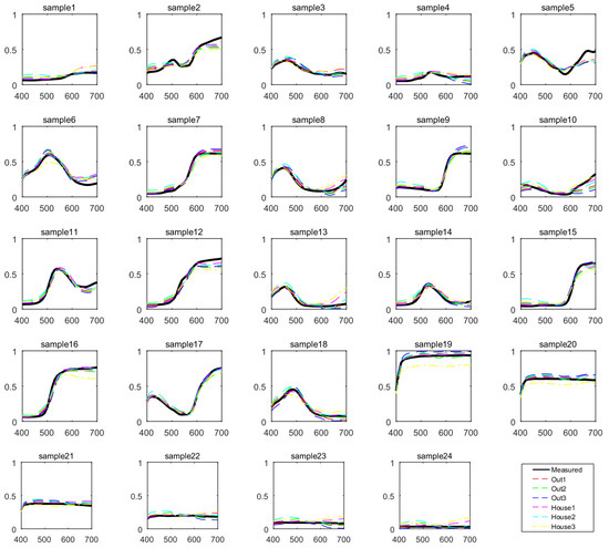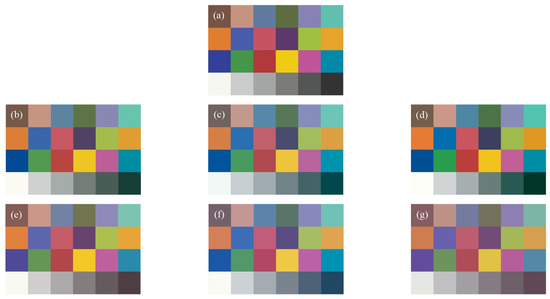 Rendered spectral measurements of CC color chart patches: (a) reference, (b) Out1, (c) Out2, (d) Out3, (e) House1, (f) House2, and (g) House3. Out1, Out2, and Out3 are samples captured under conditions of shadow, facing direct sunlight, and having one’s back to sunlight, respectively. House1, House2, and House3 were captured under the following lighting conditions: D65 light source alone, a mixture of D65 and A light sources, and a mixed scenario of indoor lighting and daylight, respectively.