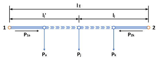 As illustrated in Figure 2, the maximum line loads in each two-terminal 110 kV power supply network are concentrated in sections 1a and 2k. Here, 1 and 2 represent node 1 and node 2 respectively. Neglecting reactive loads, the loading constraints for these critical transmission sections (1a and 2k) are as follows: